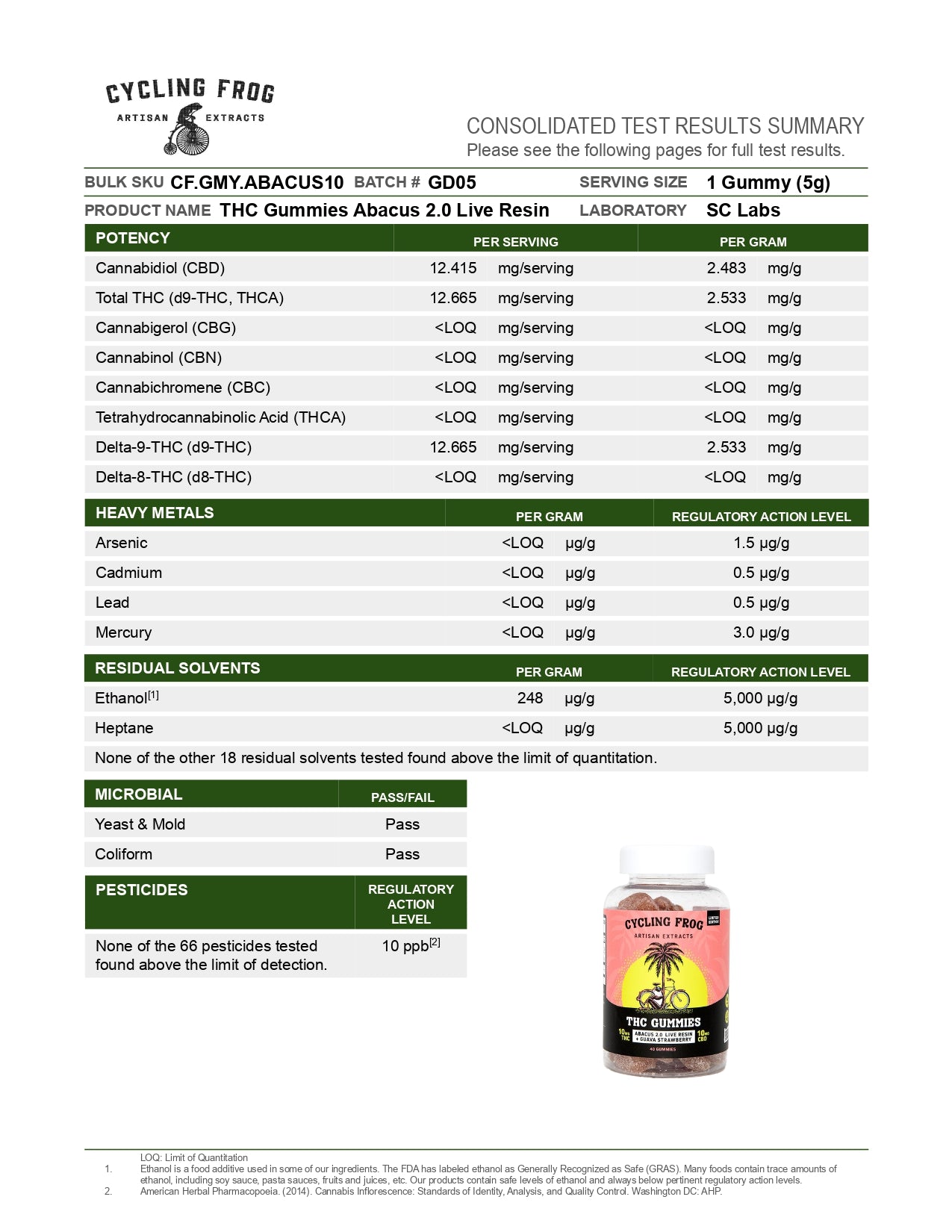 Introducing the latest sensation from Cycling Frog, the Guava Strawberry Abacus 2.0* Live Resin Gummies! These delectable treats are the second installment in our innovative Live Resin gummy line, designed to bring a perfect balance of 1:1 THC/CBD to your relaxation routine. Made with freshly harvested, flash-frozen hemp to preserve its natural essence, our live resin gummies showcase the robust terpene profile of the plant.
