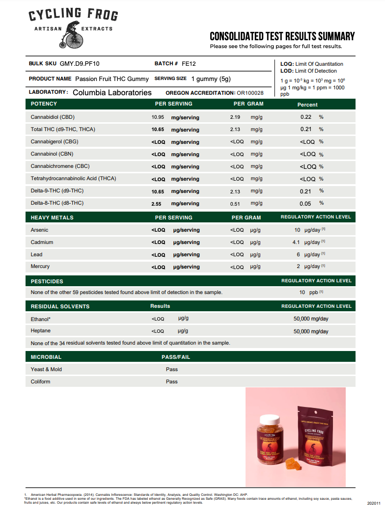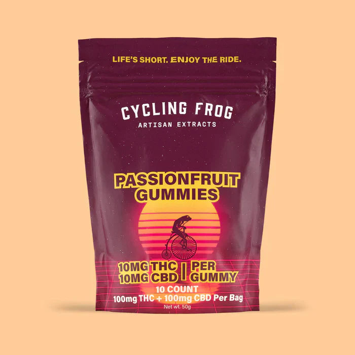 The newest addition to our edibles line, Cycling Frog Passionfruit 1:1 THC+CBD gummies provides the perfect full-spectrum balance of THC+CBD. With 10mg of both and lots of other beneficial cannabinoids packed into each delicious gummy, Cycling Frog 1:1 THC+CBD gummies are designed so you can find your own perfect balance.