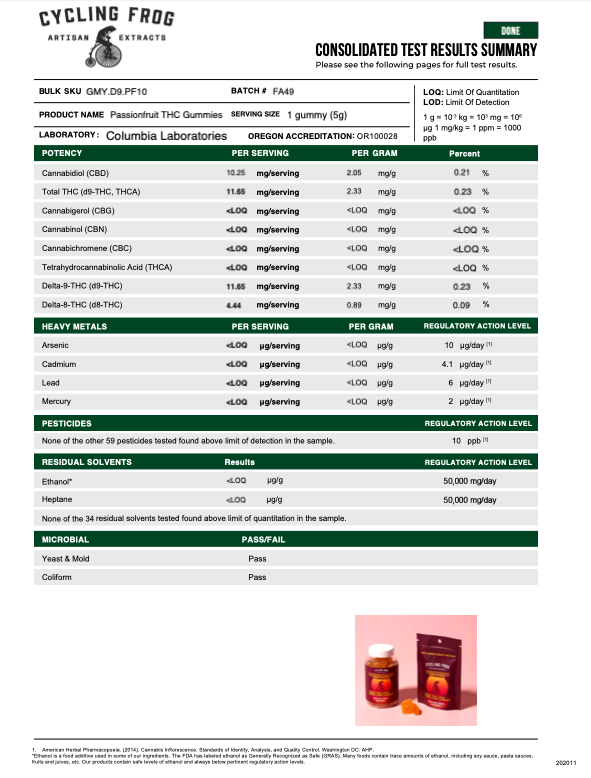 The newest addition to our edibles line, Cycling Frog Passionfruit 1:1 THC+CBD gummies provides the perfect full-spectrum balance of THC+CBD. With 10mg of both and lots of other beneficial cannabinoids packed into each delicious gummy, Cycling Frog 1:1 THC+CBD gummies are designed so you can find your own perfect balance.