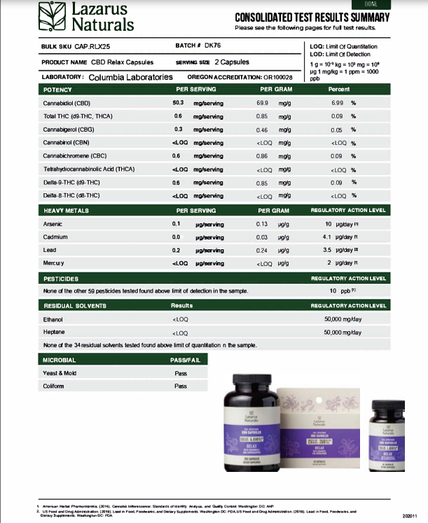 Lazarus Naturals Relax CBD Capsules are formulated to help you unwind and promote a deeper sense of calm any time of day. Each capsule pairs 25mg of our full spectrum hemp extract with functional ingredients like chamomile, ashwagandha, L-theanine, and vitamin B6. Convenient and precise, these capsules are ready to help you ease into a more tranquil state when you need it most.