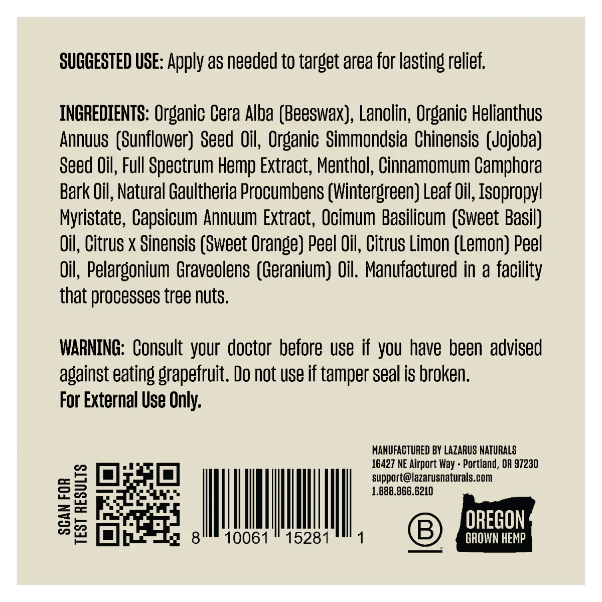 Organic Cera Alba (Beeswax), Lanolin, Organic Helianthus Annuus (Sunflower) Seed Oil, Organic Simmondsia Chinensis (Jojoba) Seed Oil, Full Spectrum Hemp Extract, Menthol, Cinnamomum Camphora Bark Oil, Natural Gaultheria Procumbens (Wintergreen) Leaf Oil, Isopropyl Myristate, Capsicum Annuum Extract, Ocimum Basilicum (Sweet Basil) Oil, Organic Citrus x Sinensis (Sweet Orange) Peel Oil, Citrus Limon (Lemon) Peel Oil, Pelargonium Graveolens (Geranium) Oil. Manufactured in a facility that processes tree nuts.