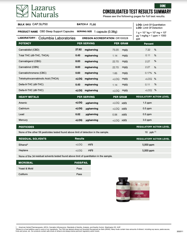 Lazarus Naturals Capsules are specifically crafted for everyday use. Its effective blend of full spectrum CBD, CBG, and CBN works hard (with functional ingredients like lemon balm and passion flower) to target and reduce restlessness, promote healthier sleeping habits, and encourage a full night’s rest. Convenient and consistent, these 50mg capsules are perfect for any nightly routine seeking to maintain a regulated sleeping pattern.