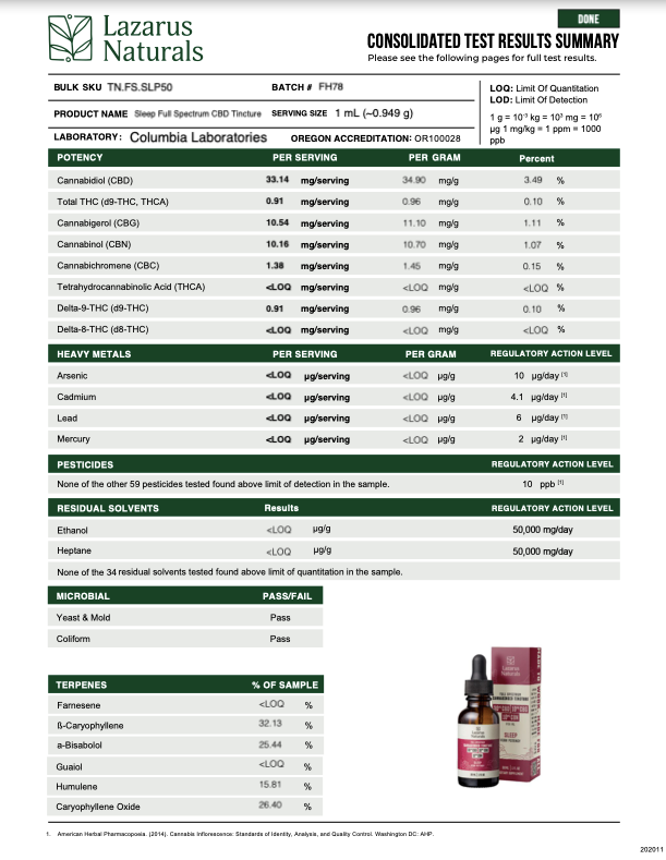 Cannabinoids' effects are highly individual. To find the amount of Sleep Tincture that is right for you, start with 1-2 ml and adjust as needed. Each milliliter contains 30 mg of CBD, 10 mg of CBG, and 10 mg of CBN.