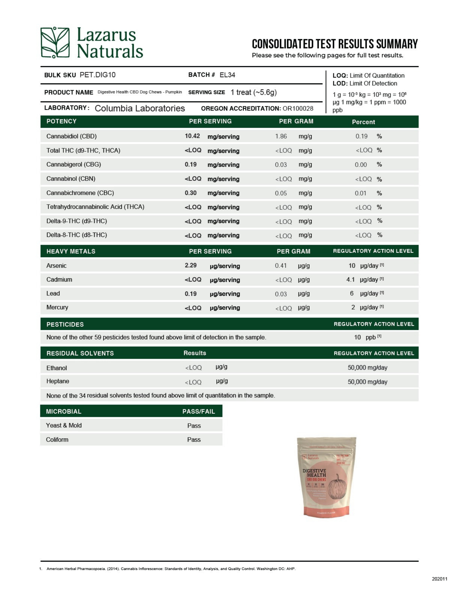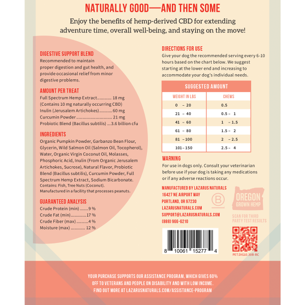 Using hemp grown on our own Lazarus Farms, we render CBD-rich extract from the plant using an ethanol-based process. We then dilute the extract with fractionated coconut oil to ensure accurate CBD concentration according to product potency. Our pet treats use full spectrum CBD. All of our CBD pet treats are third-party tested for potency, pesticides and heavy metals. Our testing process ensures we offer a product that is natural, safe and consistent. All test results are available under the Test Results tab. Ingredients: Organic Pumpkin Powder, Garbanzo Bean Flour, Glycerin, Water, Salmon Oil, Fish Oil (EPA, DHA), Molasses, Organic Virgin Coconut Oil, Phosphoric Acid, Hydrolyzed Fish Collagen, Glucosamine HCL, Natural Flavors, Curcumin Powder, Full Spectrum Hemp Extract, Sodium Bicarbonate. Contains: Tree Nuts (Coconut), Fish. Manufactured in a facility that processes peanuts. For use with dogs only. Consult your veterinarian before use if your dog is taking any medications or if any adverse reactions occur.