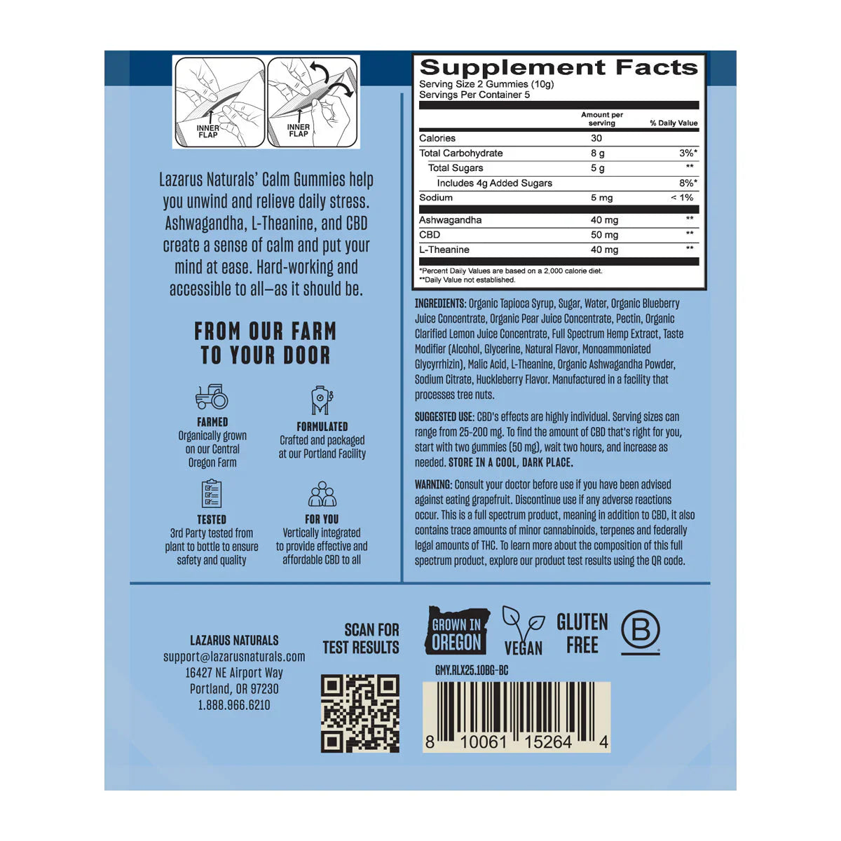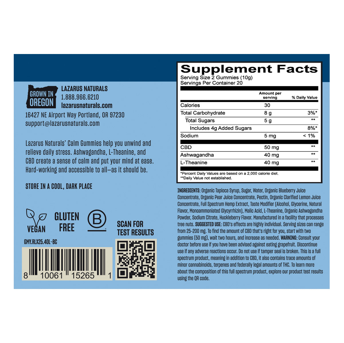 Organic Tapioca Syrup, Sugar, Water, Organic Blueberry Juice Concentrate, Organic Pear Juice Concentrate, Pectin, Natural Flavors, Organic Lemon Juice Concentrate, Full Spectrum Hemp Extract, Malic Acid, L-Theanine, Organic Ashwagandha Powder, Sodium Citrate. Contains: Tree Nuts (Coconut).