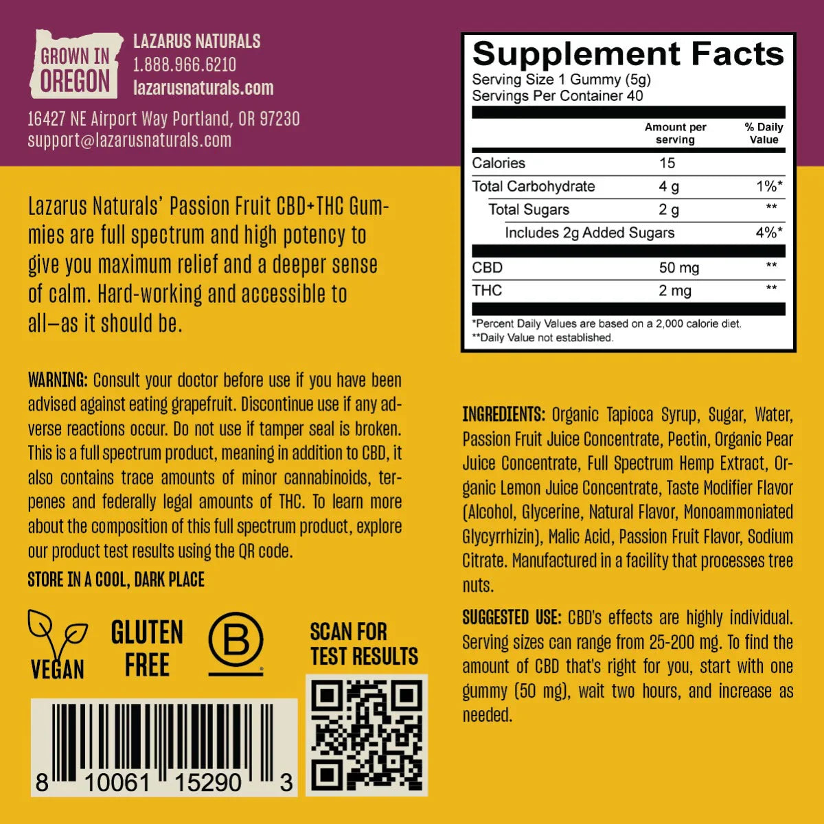 Passion Fruit CBD + THC Gummies are infused with our full spectrum CBD and all-natural fruit flavor, with 50mg of high potency CBD and 2mg of THC packed into each gummy. The benefits from the CBD you know and trust receive a boost thanks to the entourage effect—scientifically shown to be even more effective as the cannabinoids (like THC) and terpenes naturally found within hemp work better together.