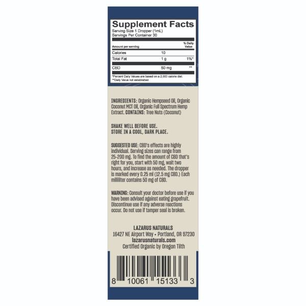 Using hemp grown on our own Lazarus Farms, we render CBD-rich extract from the plant using an ethanol-based process. We then dilute the extract with fractionated coconut oil to ensure accurate CBD concentration according to product potency. This CBD tincture uses whole plant extract containing a broad spectrum of naturally occurring cannabinoids and terpenes. All of our CBD tinctures are third-party tested for potency, pesticides and heavy metals. Our testing process ensures we offer a product that is natural, safe and consistent. All test results are available under the Test Results tab.
