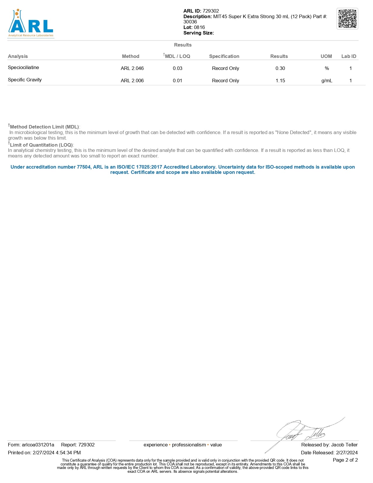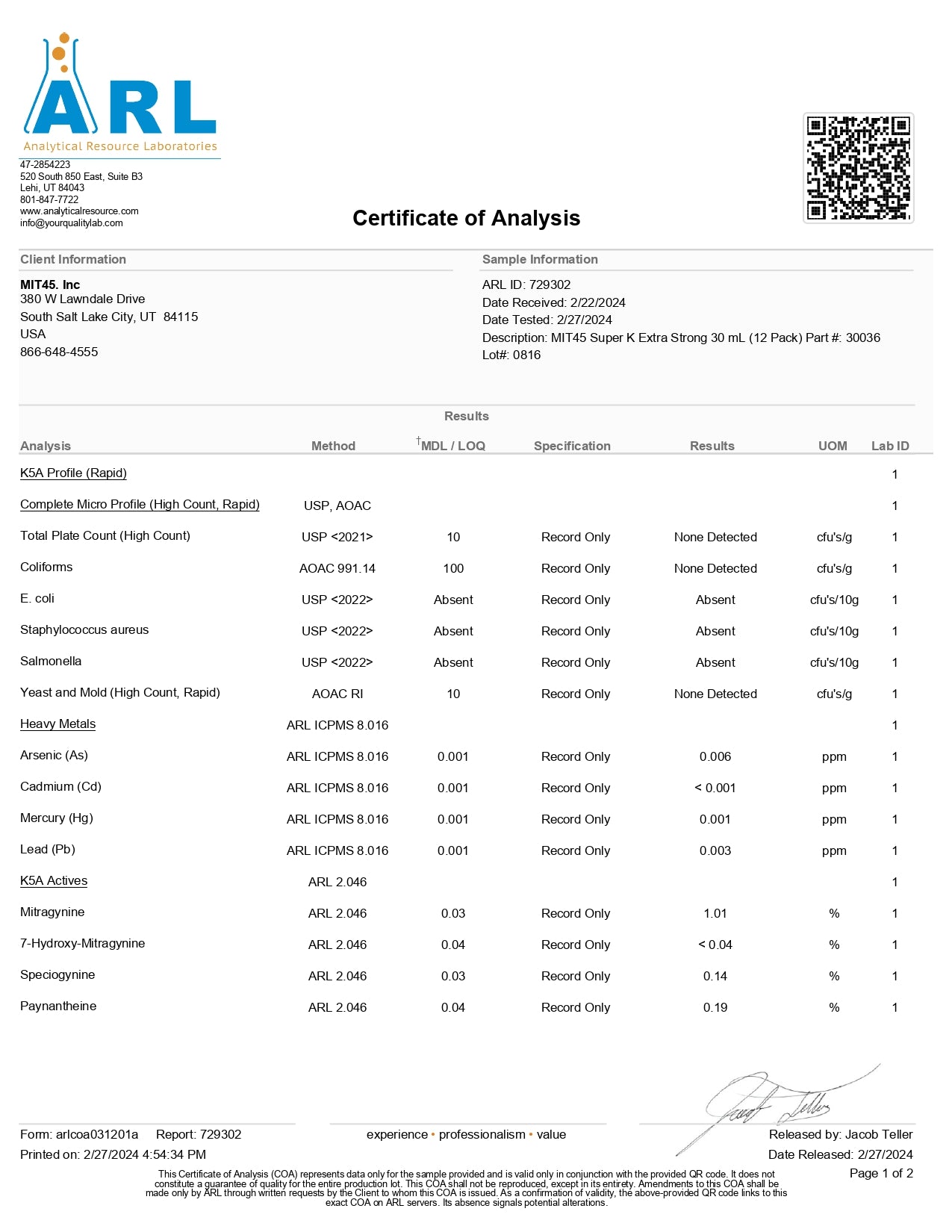 Each 30 ml bottle of MIT45 Super K Extra Strong contains 1,200 mg of Mitragyna speciosa extract and is recommended for 5-6 servings. Users recommend Super K Extra Strong for evening or nighttime use. Please, consume responsibly.