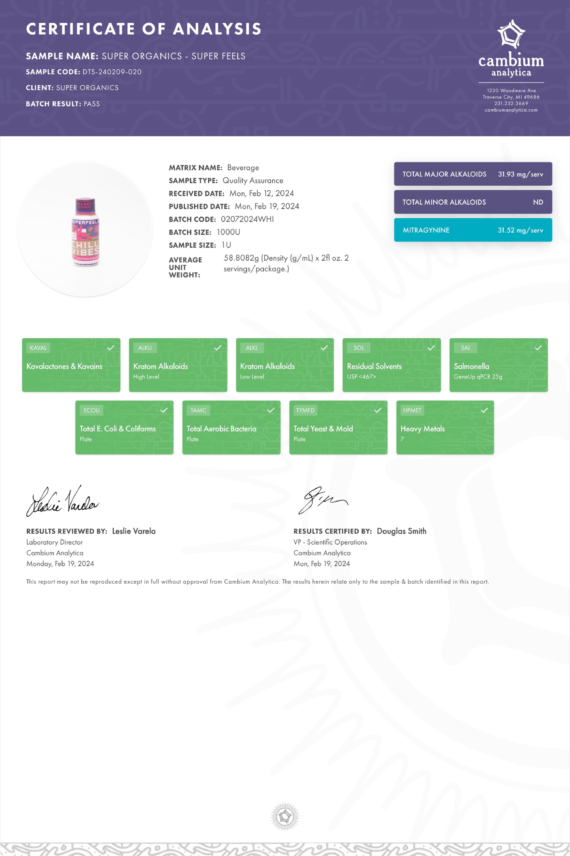 Dive deep into relaxation with Super Feels Chill Vibes: Kava & Kratom Shot by Super Speciosa. Each shot contains 35mg of kratom extract and 25mg of kava extract, providing rapid-release relaxation and soothing serenity for body and mind.