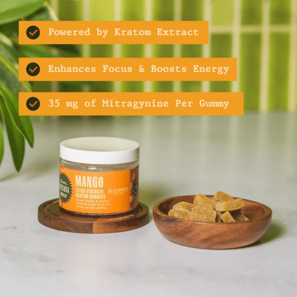 Discover the power of kratom in a convenient, delicious gummy! These Extra Strength Kratom Gummies come in three amazing flavors: blueberry, mango, and strawberry. Each gummy is designed for those who need a potent, on-the-go kratom experience. Each gummy packs about 35mg of mitragynine, equal to 2.33 grams of kratom powder with a 1.5% mitragynine level.