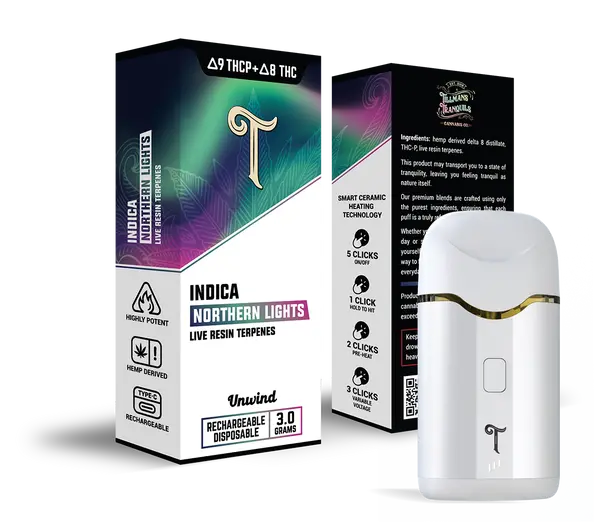 Northern Lights Strain – Indica Includes Live Resin Terpenes Infused with Delta 8 and Delta 9 THCp 3.0 gram disposable northern lights vape 6% Terpenes Tropicana Cookies Strain – Sativa 6% Live Resin Terpenes Infused with Delta 8 and Delta 9 THCp 3.0 gram disposable vape device Banana Runtz Strain – Hybrid Live Resin Terpenes Δ9 THCp + Δ8 THC