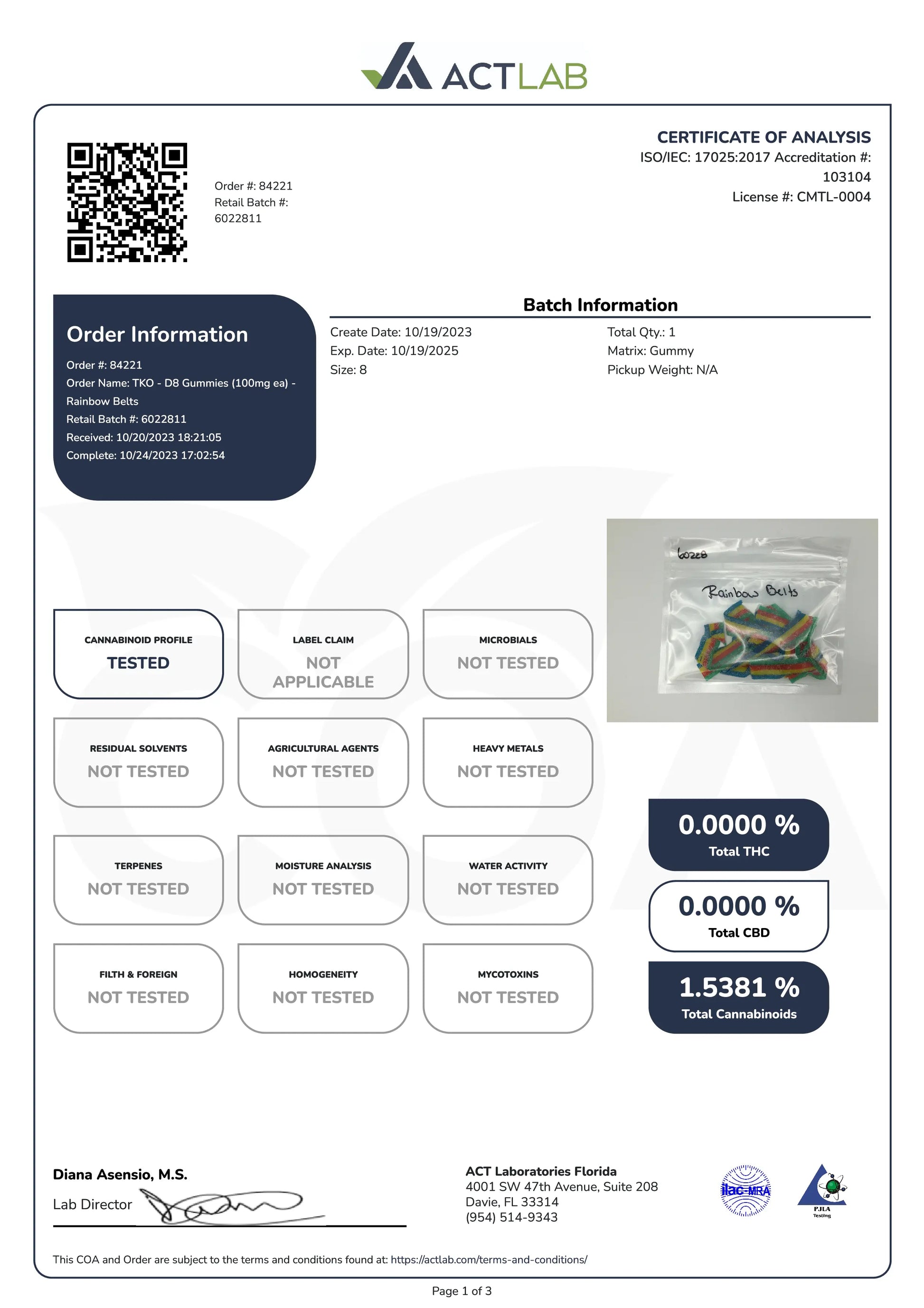 TKO D-8 Infused Gummies 500mg- Rainbow Belts