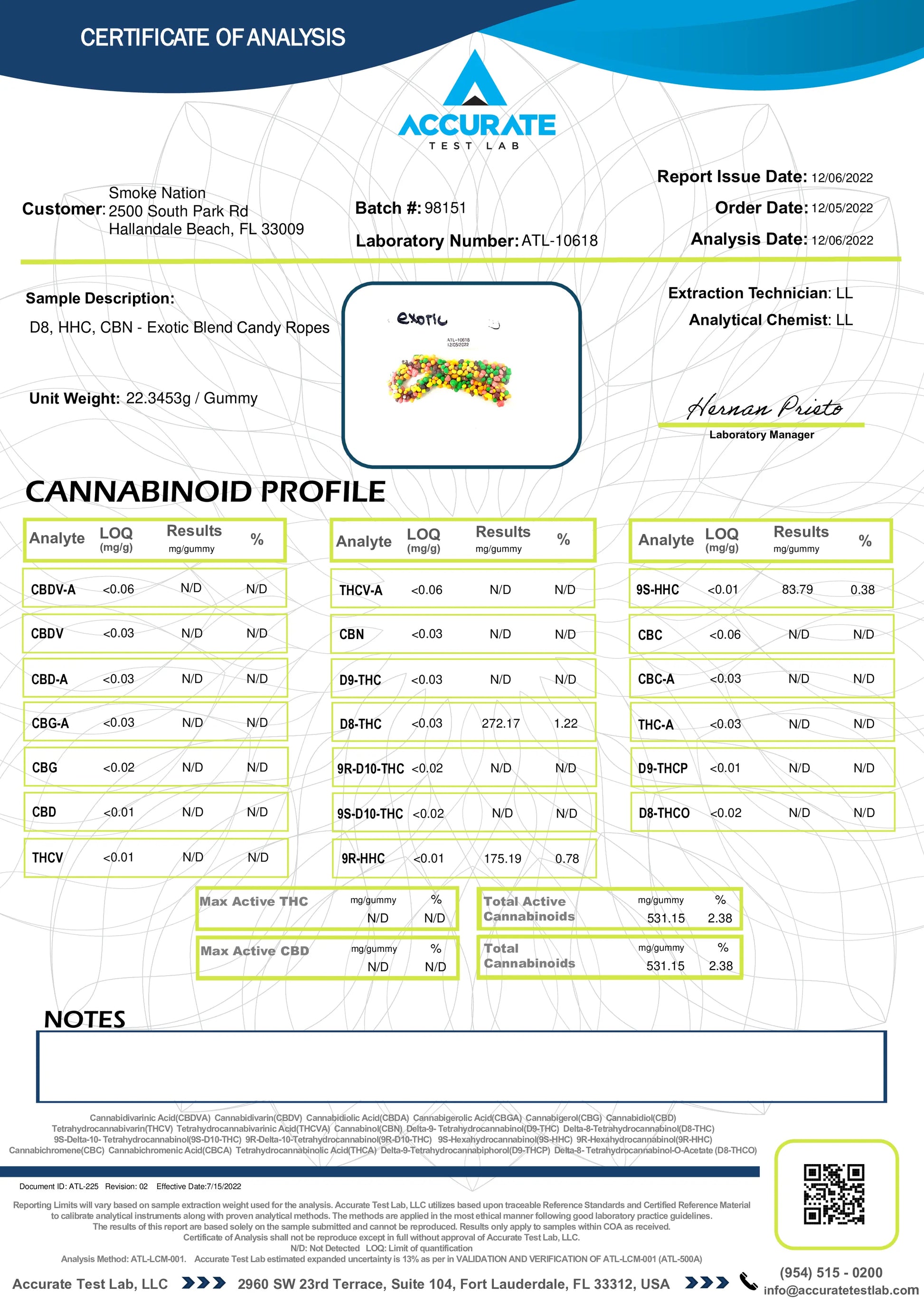 Ingredients:Exotic Blend Hemp Oil, Dextrose, Sugar, Corn Syrup, and Less thank 2% of Malic Acid, Gelatin, Confectioner's Glaze (Lac_Resin), Glycerin, Citric Acid, Carnauba Wax, Natural Flavors, Color Added, Carmine Color, Blue 1, Blue 1 Lake, Blue 2 Lake, Red 40, Red 40 Lake, Yellow 5 Lake. May contain egg